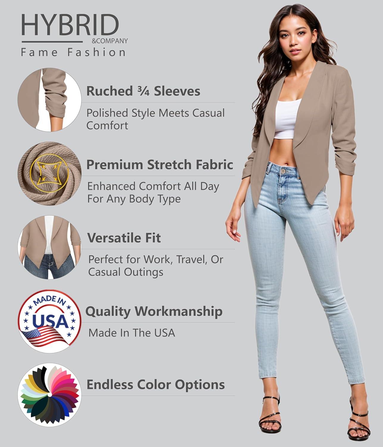 Hybrid & Company Lightweight Open Front Cardigan Classic Ruched Sleeve Work Office Blazer Suit Jackets(Beige)