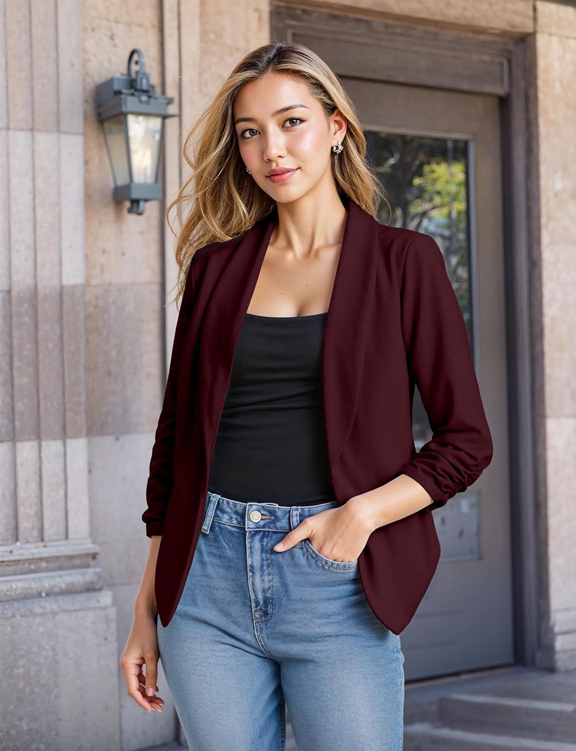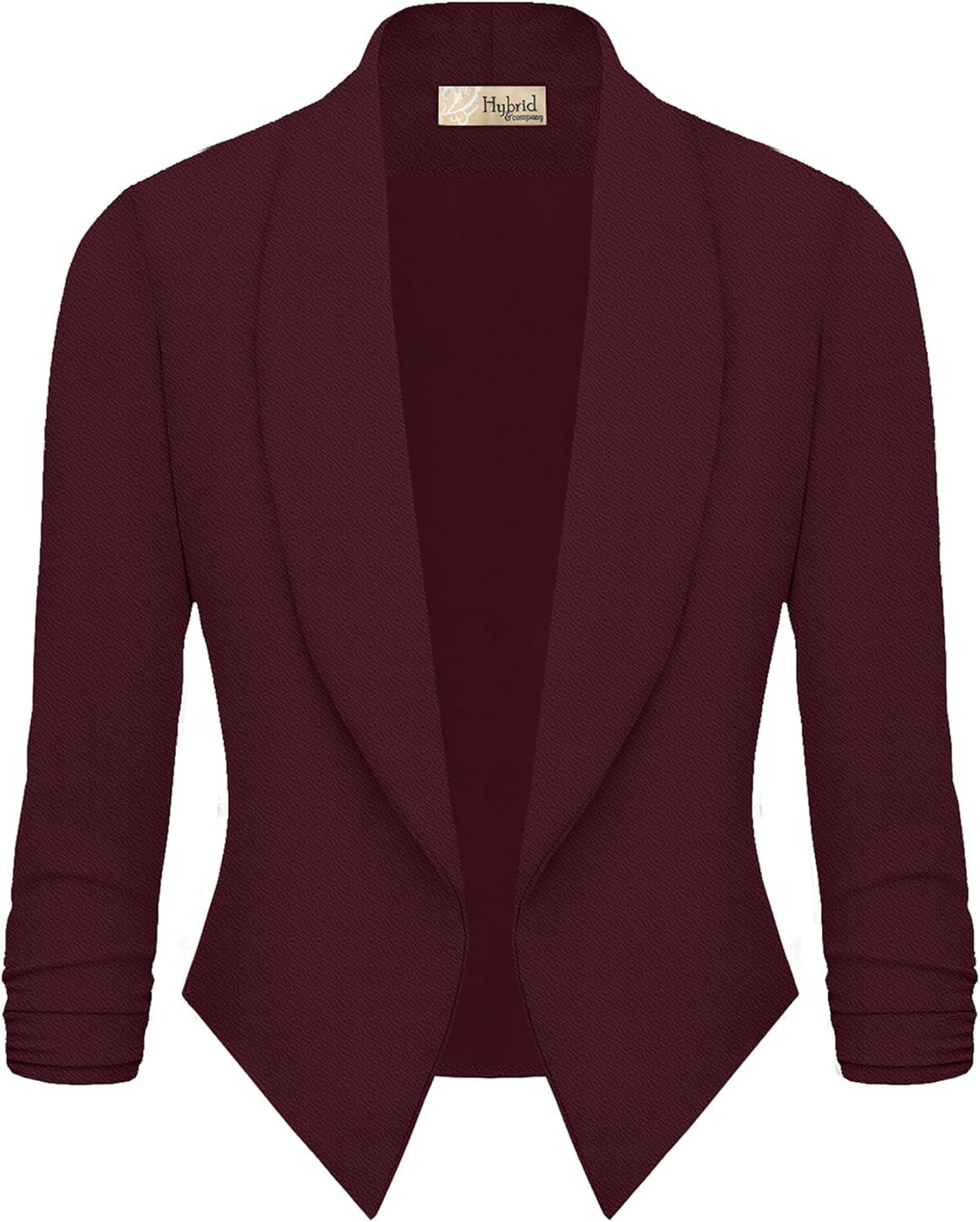 Hybrid & Company Lightweight Open Front Cardigan Classic Ruched Sleeve Work Office Blazer Suit Jackets(Burgundy)
