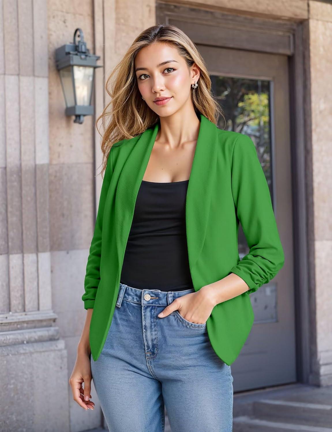 image:imageHybrid amp Company Lightweight Open Front Cardigan Classic Ruched Sleeve Work Office Blazer Suit JacketsKgreen