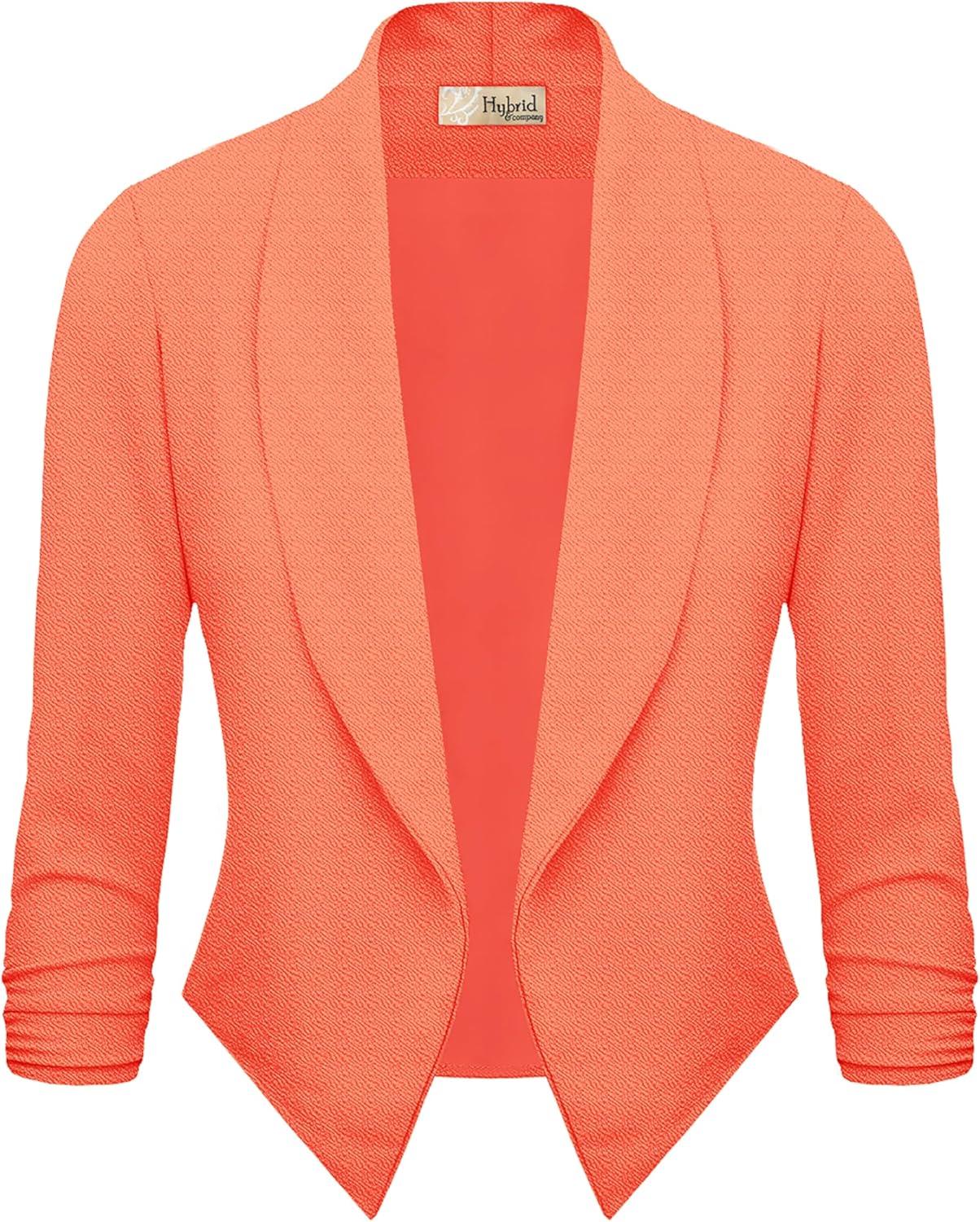 Hybrid & Company Lightweight Open Front Cardigan Classic Ruched Sleeve Work Office Blazer Suit Jackets(Neon Coral)
