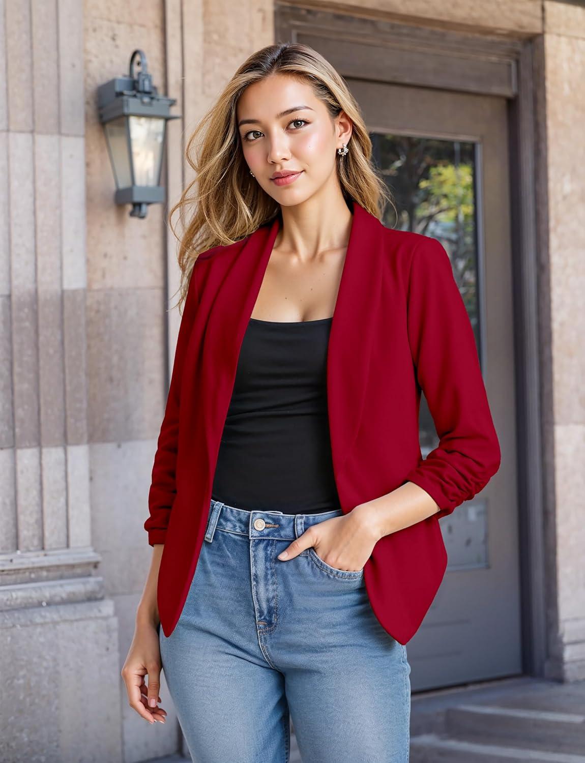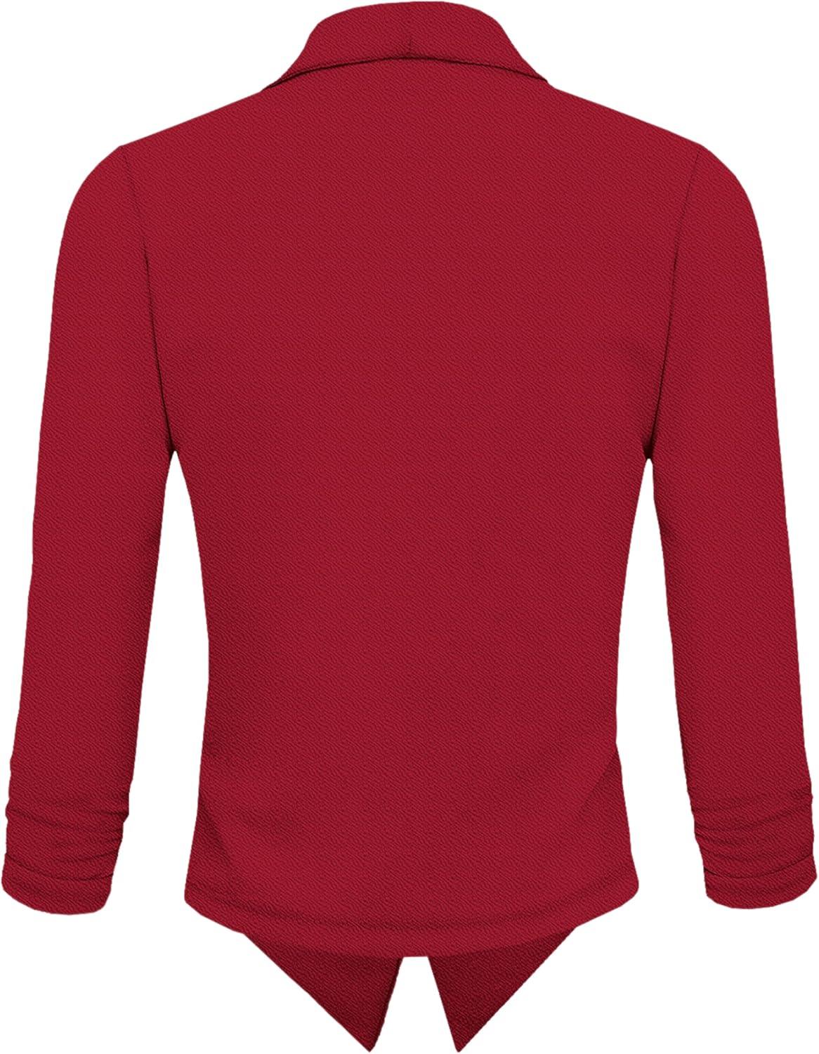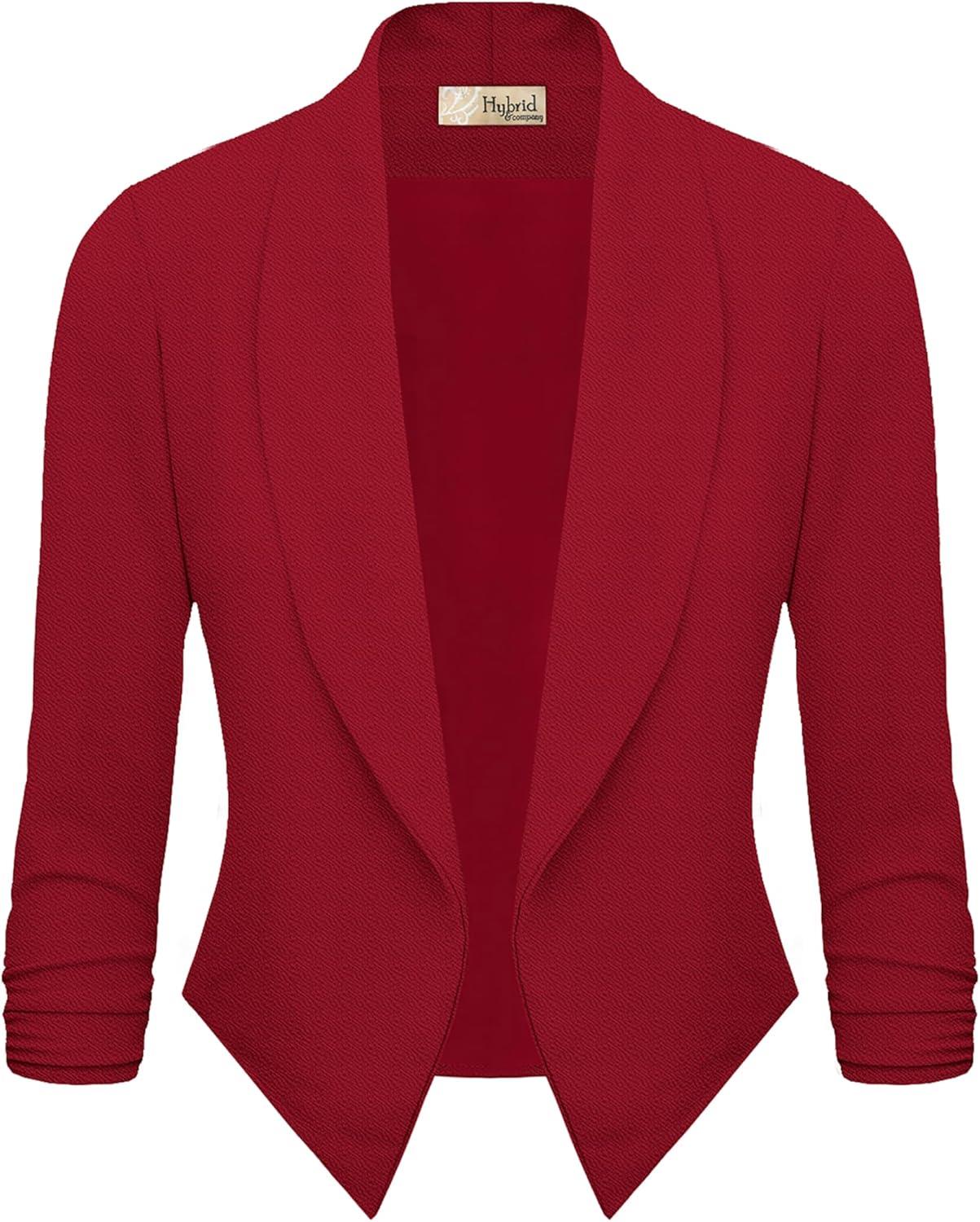 Hybrid & Company Lightweight Open Front Cardigan Classic Ruched Sleeve Work Office Blazer Suit Jackets(Red)