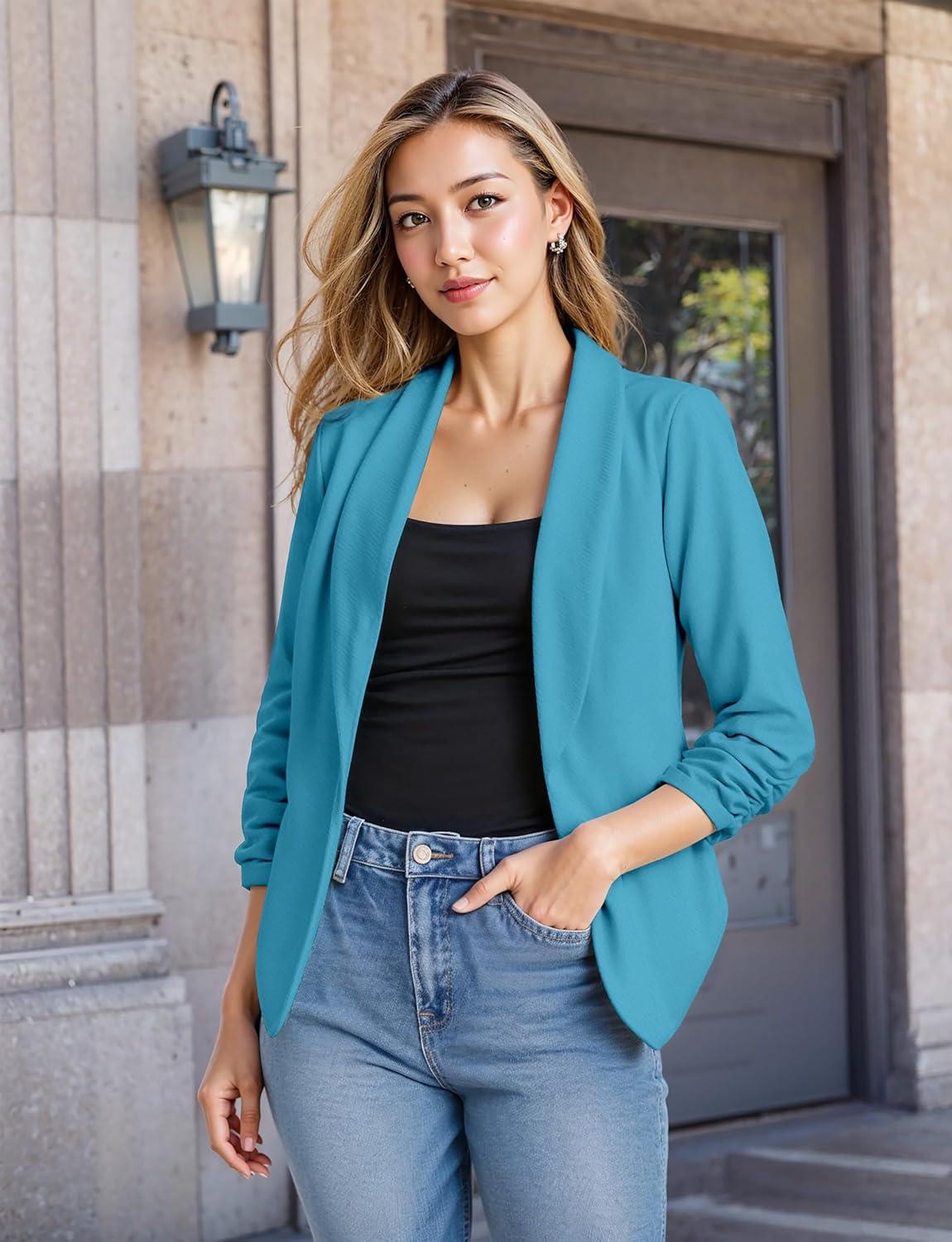 Hybrid & Company Lightweight Open Front Cardigan Classic Ruched Sleeve Work Office Blazer Suit Jackets(Teal)