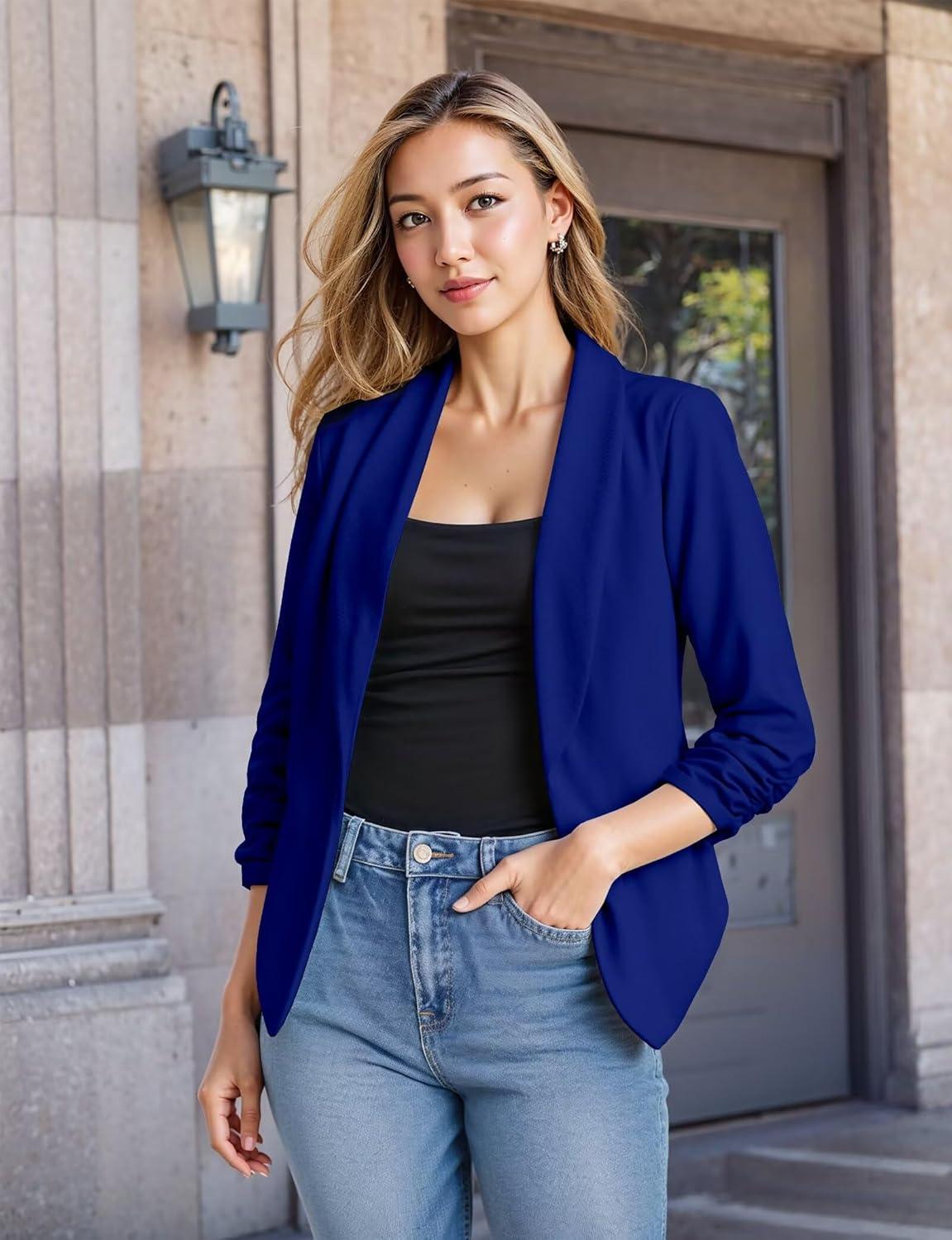 Hybrid & Company Women's Casual Work Office Blazer Jacket Open Front Shawl with 3/4 Scrunch Sleeves(Cobaltblue)