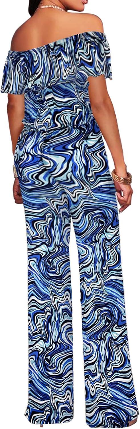 Hybrid & Company Women's Lightweight Off Shoulder Jumpsuit – Stretchy Wide Leg Romper – Casual to Formal One Piece Outfit(11386-navy Multi)