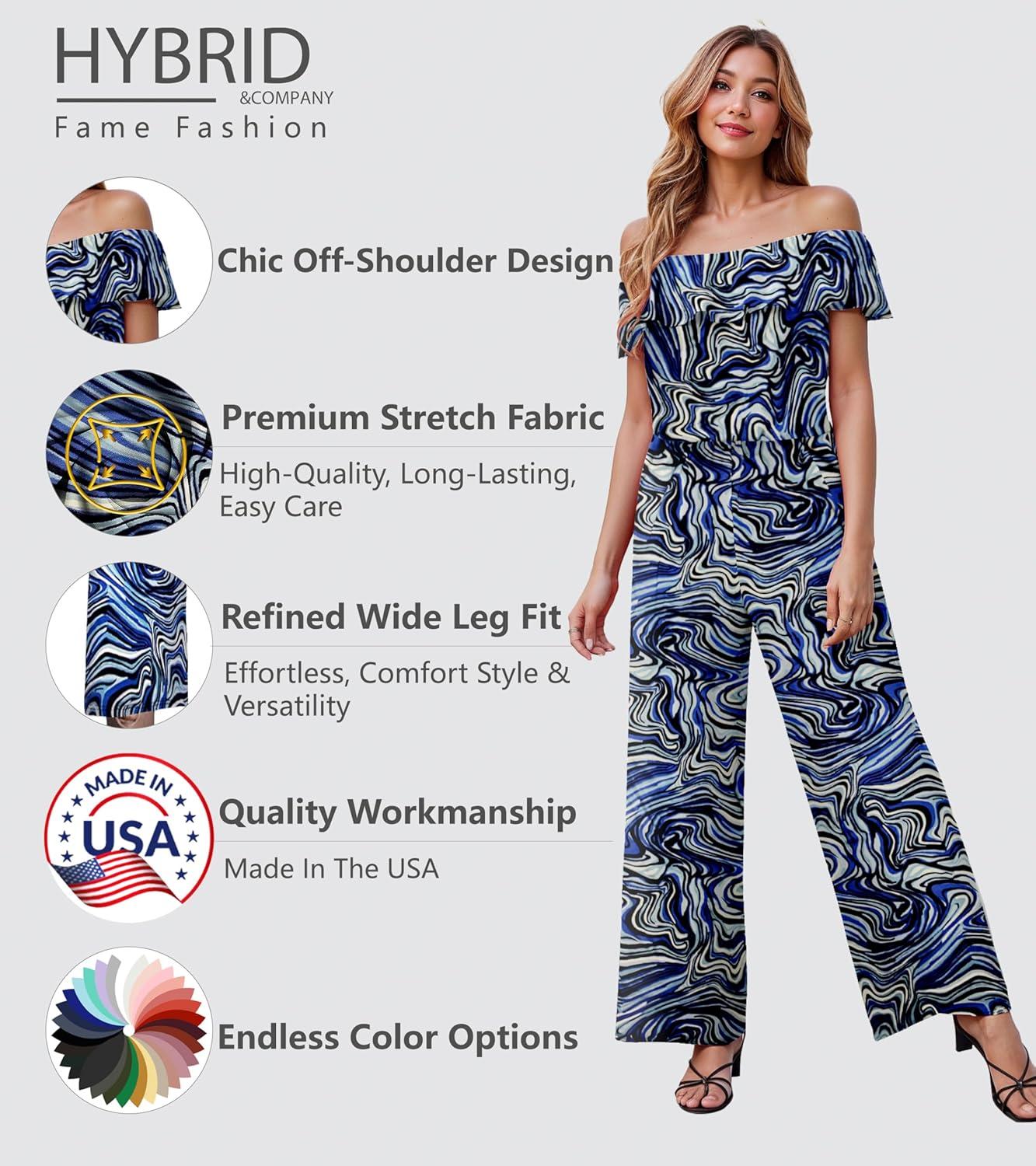 Hybrid & Company Women’s Lightweight Off Shoulder Jumpsuit – Stretchy Wide Leg Romper – Casual to Formal One Piece Outfit(11386-navy Multi)