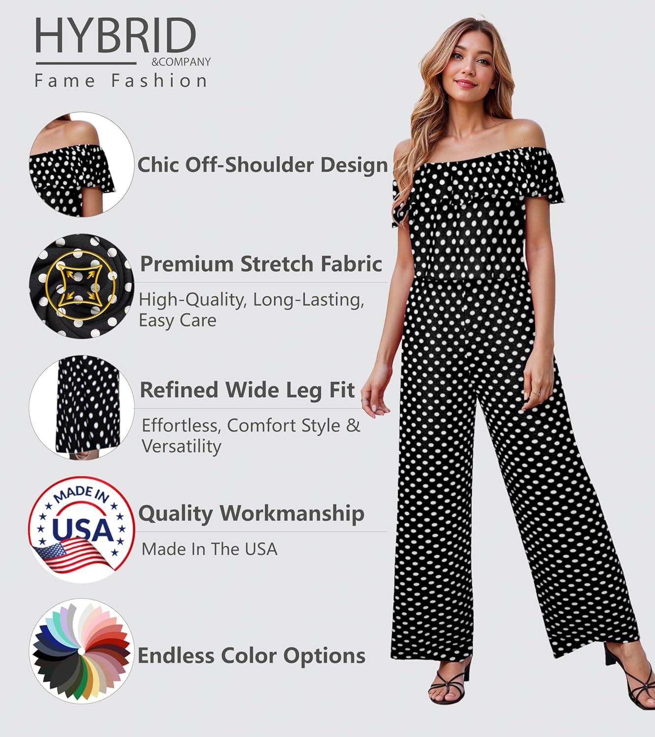 Hybrid & Company Women's Lightweight Off Shoulder Jumpsuit – Stretchy Wide Leg Romper – Casual to Formal One Piece Outfit(Black and White)