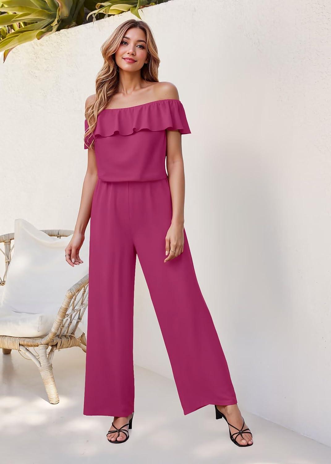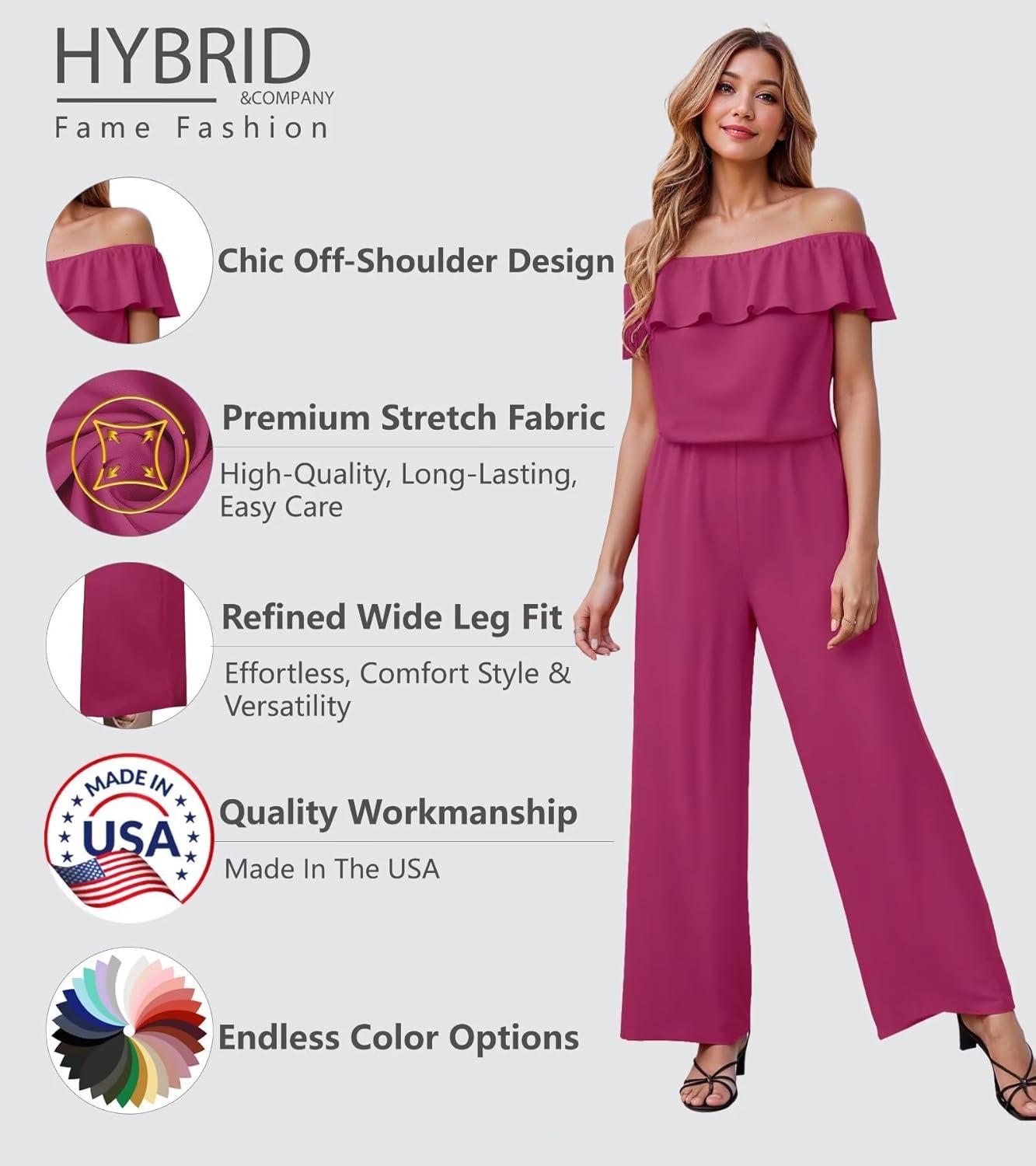 Hybrid & Company Women’s Lightweight Off Shoulder Jumpsuit – Stretchy Wide Leg Romper – Casual to Formal One Piece Outfit(Hotpink)
