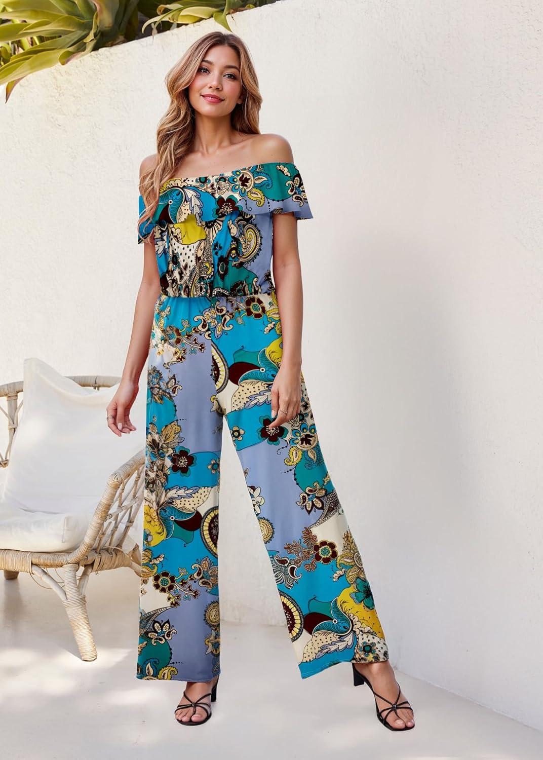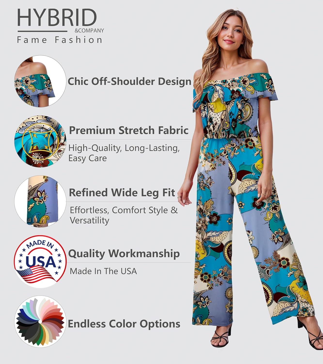 Hybrid & Company Women’s Lightweight Off Shoulder Jumpsuit – Stretchy Wide Leg Romper – Casual to Formal One Piece Outfit(I219950-pinkmulti)