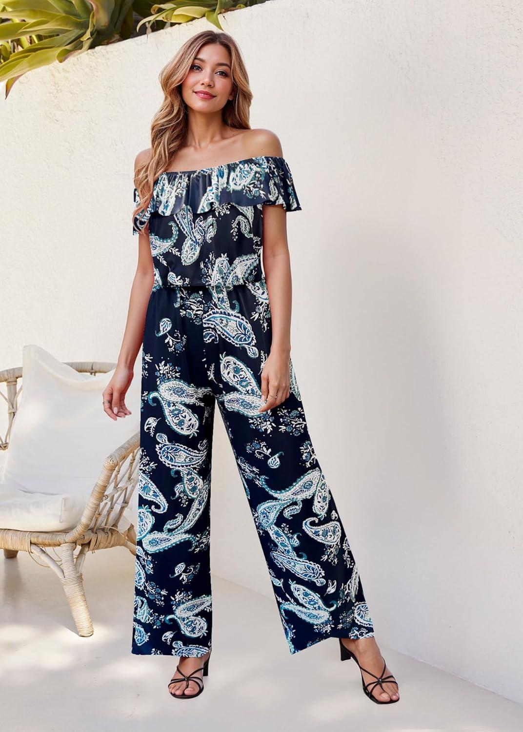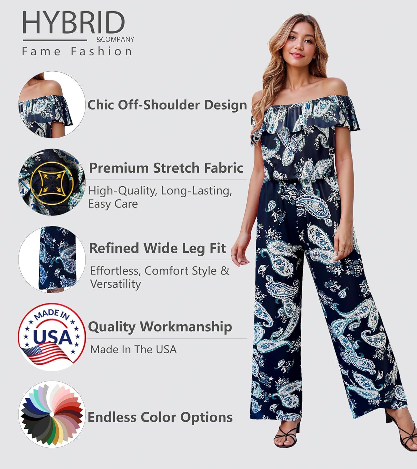 Hybrid & Company Women’s Lightweight Off Shoulder Jumpsuit – Stretchy Wide Leg Romper – Casual to Formal One Piece Outfit(K199233-navymulti)