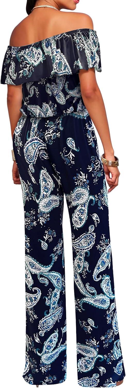 Hybrid & Company Women's Lightweight Off Shoulder Jumpsuit – Stretchy Wide Leg Romper – Casual to Formal One Piece Outfit(K199233-navymulti)