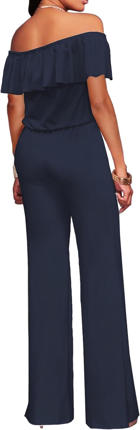 Hybrid & Company Women's Lightweight Off Shoulder Jumpsuit – Stretchy Wide Leg Romper – Casual to Formal One Piece Outfit(Navy)