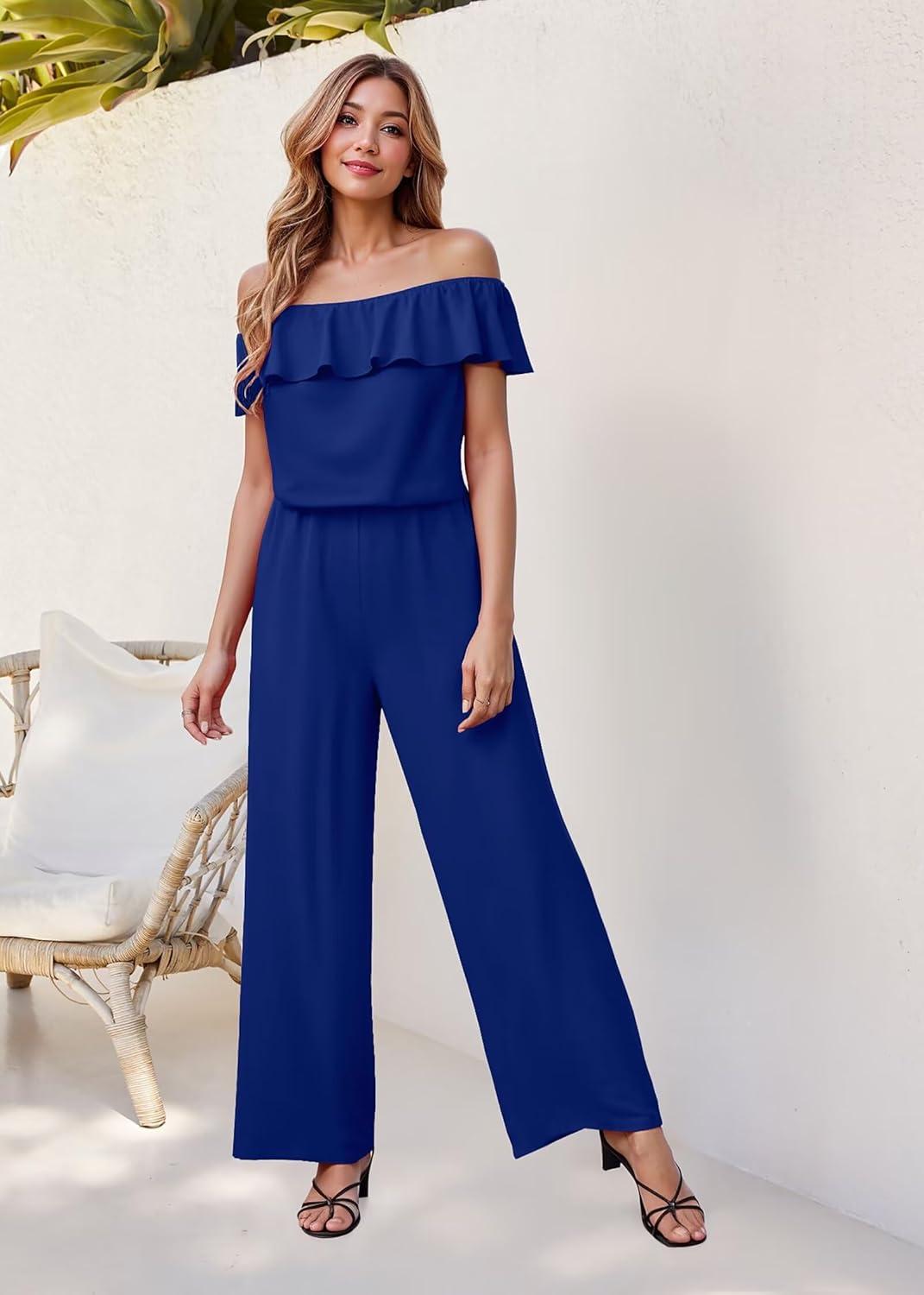 Hybrid & Company Women's Lightweight Off Shoulder Jumpsuit – Stretchy Wide Leg Romper – Casual to Formal One Piece Outfit(Royal)