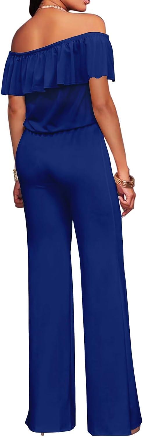 Hybrid & Company Women’s Lightweight Off Shoulder Jumpsuit – Stretchy Wide Leg Romper – Casual to Formal One Piece Outfit(Royal)