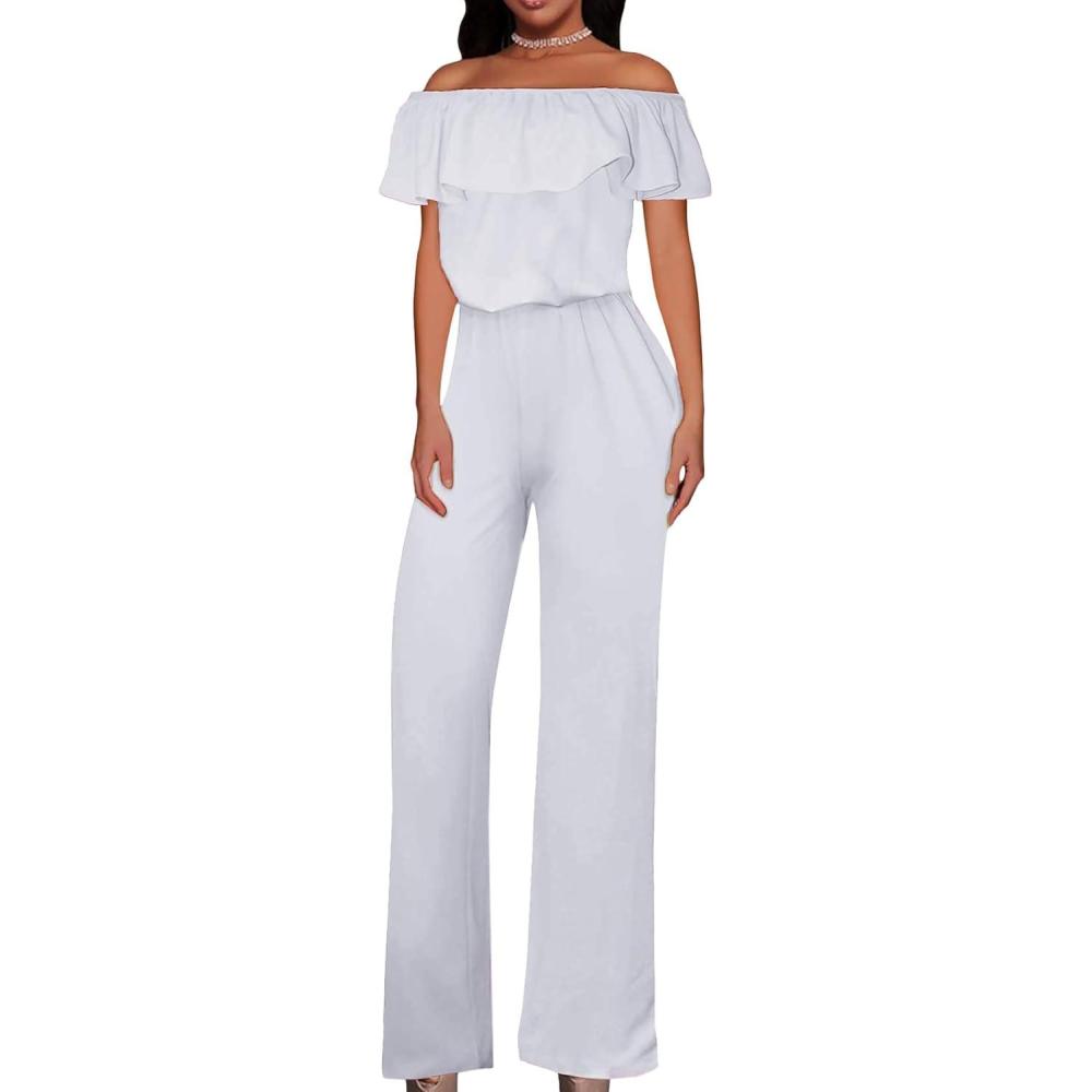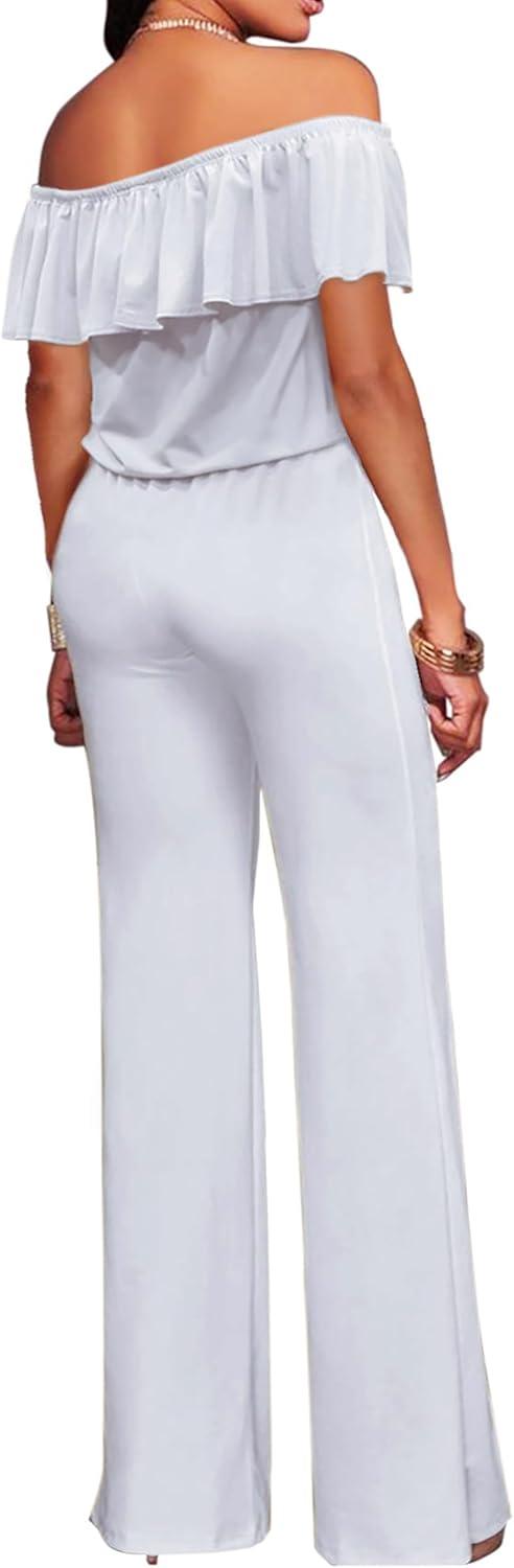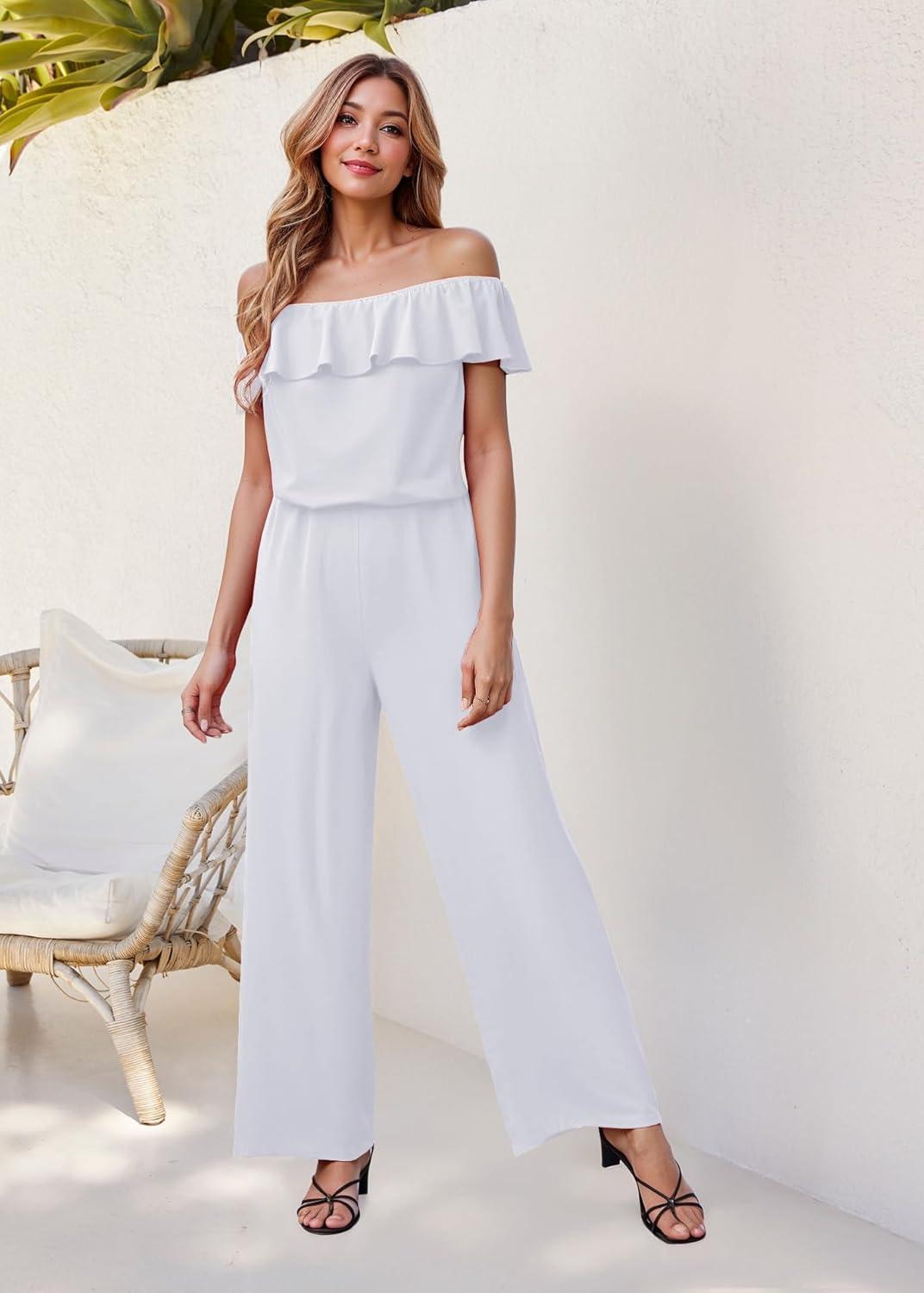 Hybrid & Company Women's Lightweight Off Shoulder Jumpsuit – Stretchy Wide Leg Romper – Casual to Formal One Piece Outfit(White)