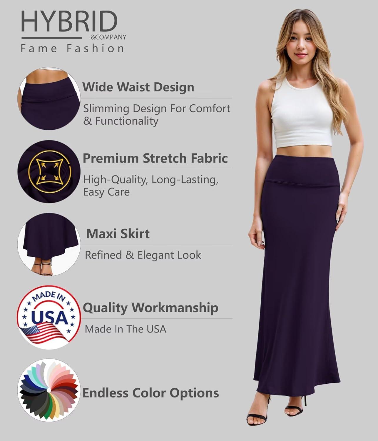 Hybrid & Company Women’s Stretch Lightweight Flowy Maxi Skirt – Casual Fold Over Waist, Made in USA(Ksksd9500-1017-black)