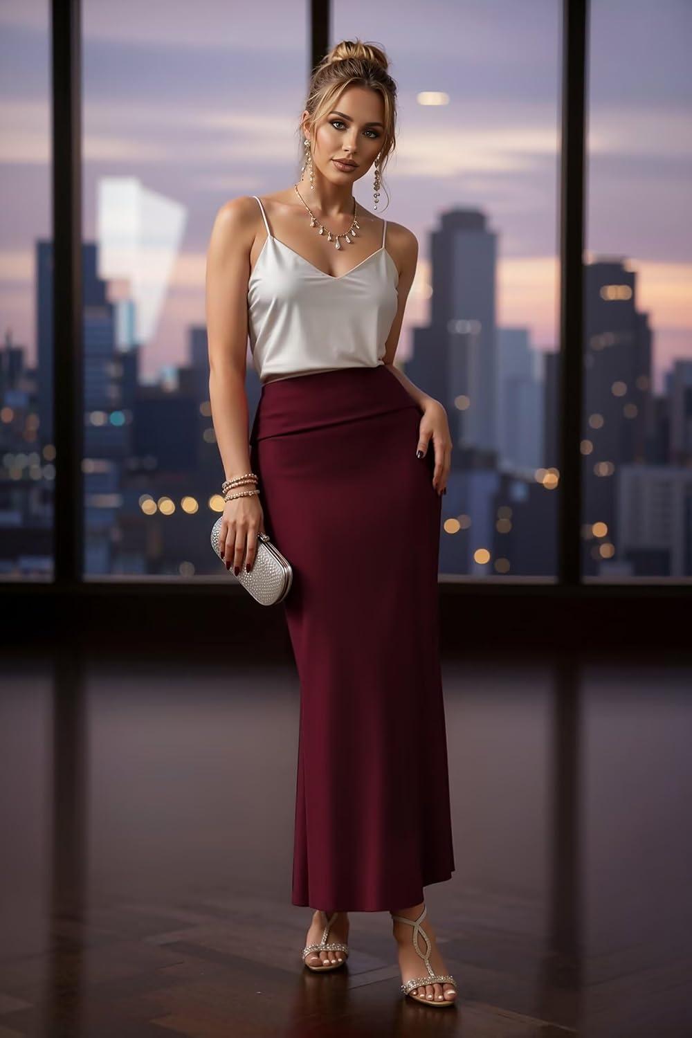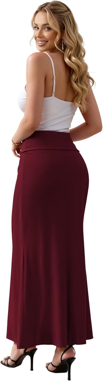 Hybrid & Company Women's Stretch Lightweight Flowy Maxi Skirt – Casual Fold Over Waist, Made in USA(Wine)