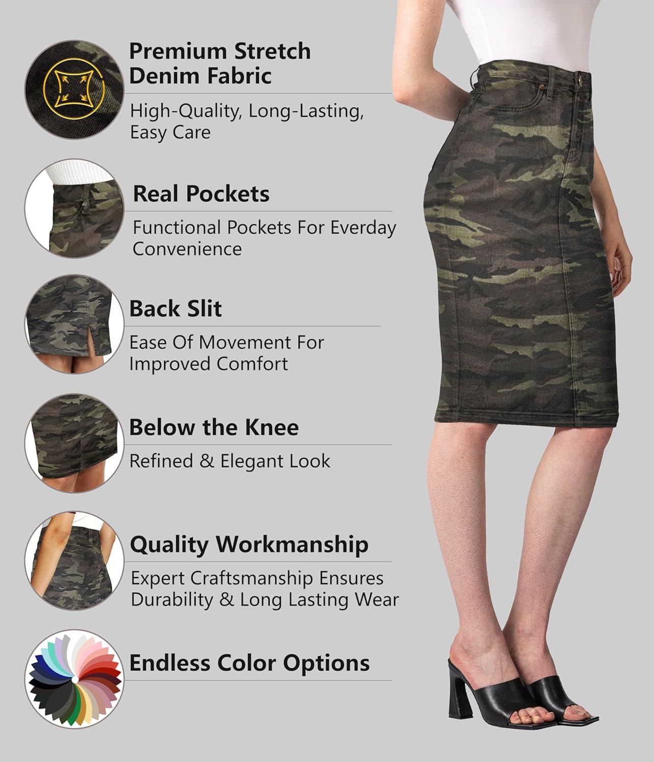 Lexi Womens Stretch Pencil Skirts with Functional Pockets, A Line & Destructed Mini Denim Skirts(Sks26147-camo)